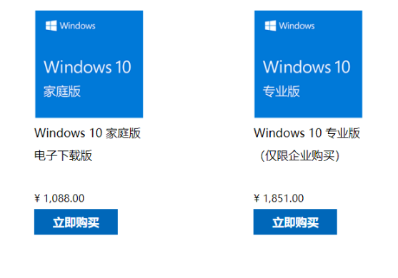 裝正版win10要多少錢呢?首先進入微軟官網,此時即可看到Win10家庭版需要1088元,而Win10專業版需要1851元,個人用戶只可以購買家庭版,專業版則需要企業用戶才可以購買。