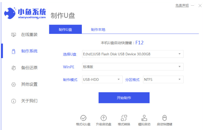 1、在一臺可用的電腦中插入空白u盤,下載安裝好小魚一鍵重裝系統工具并打開,選擇u盤重裝系統模式,點擊開始制作。