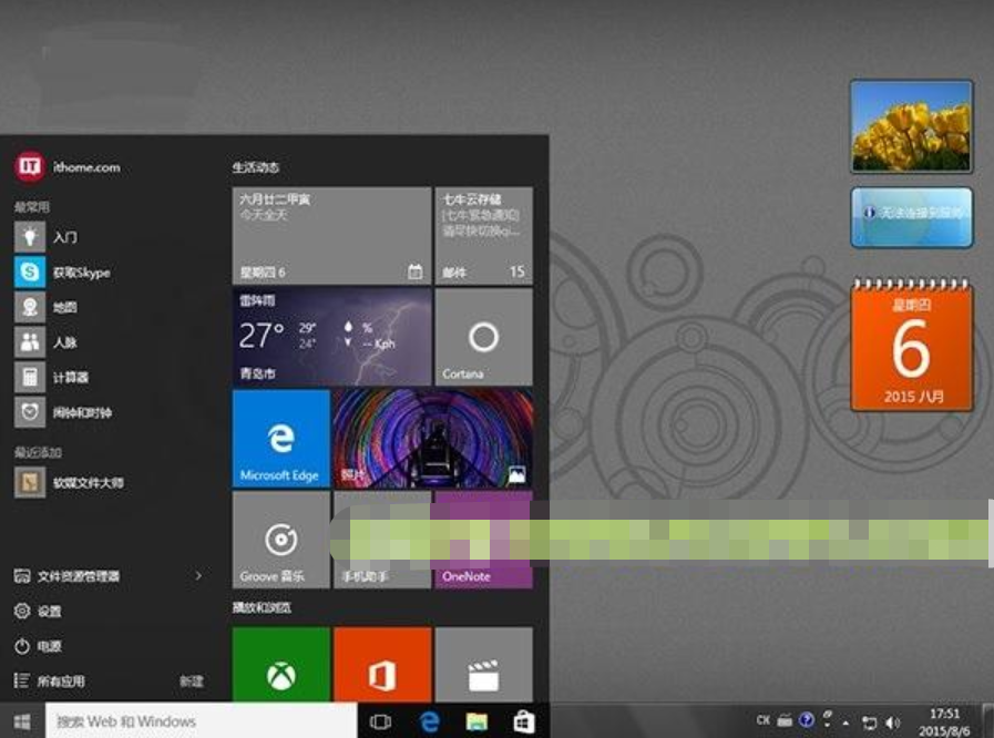 2、開始菜單榮耀回歸。大家熟悉的開始菜單回來了!并且一個重要改進,開始菜單可以進行全局搜索,搜索范圍包括本地PC內容和網絡內容。同時,開始菜單右側附帶了新的“格子“抑或稱為”磁貼(源生于win8的特點被win10繼承)“。有系統通知、日期、天氣、郵件、常用程序等等功能,而且顯示項目可以自由定制選擇和排列順序,并且可以隨意調整顯示項目大小尺寸。下圖即為隨意將facebook圖標移動添加到磁貼中的操作演示。