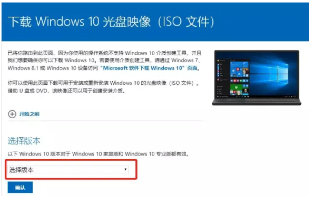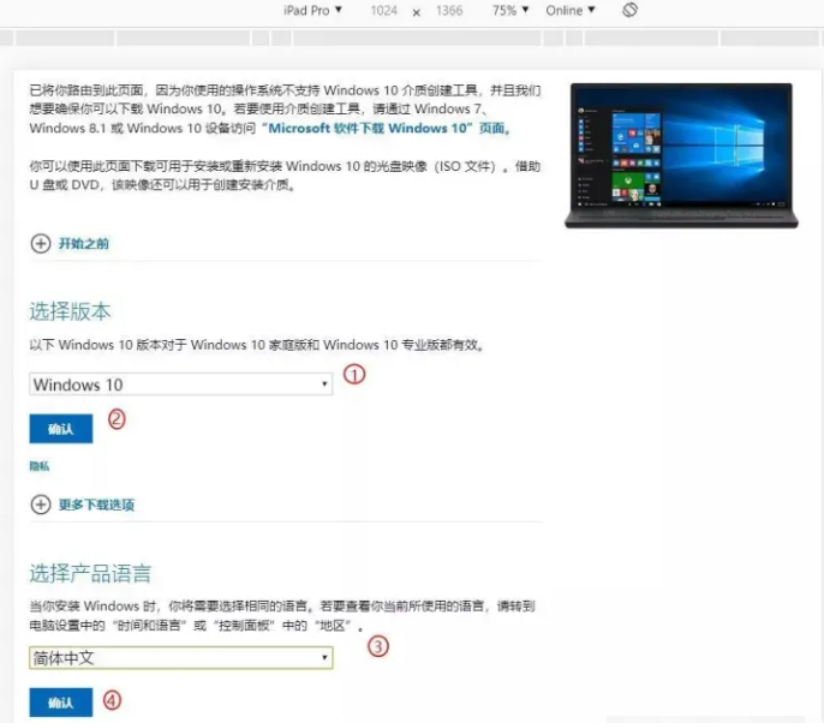 4、刷新頁面后,就能看到微軟官網界面發生變化,選擇版本下拉框。