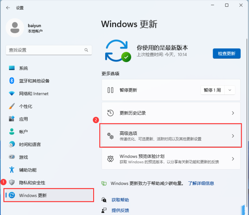 2、設置窗口,左側邊欄點擊【Windows 更新】,右側邊欄點擊【高級選項(傳遞優化、可選更新、活躍時間以及其他更新設置)】;