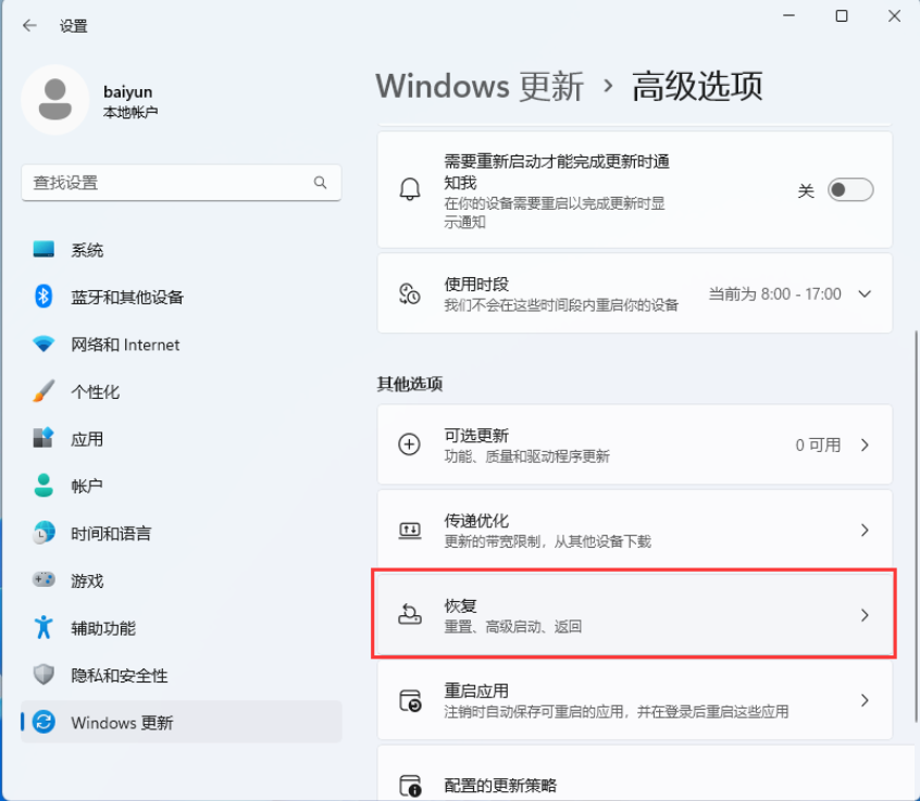 3、當前路徑為:Windows 更新 > 高級選項,然后點擊其他選項下的【恢復(重置、高級啟動、返回)】;