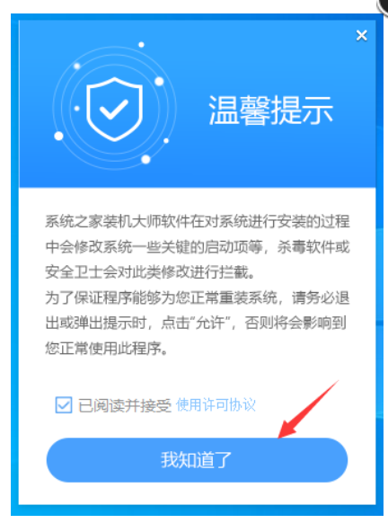 1、首先,下載系統之家裝機大師;下載完畢后,關閉所有的殺毒軟件,然后打開軟件,軟件會進行提示,仔細閱讀后,點擊我知道了進入工具。