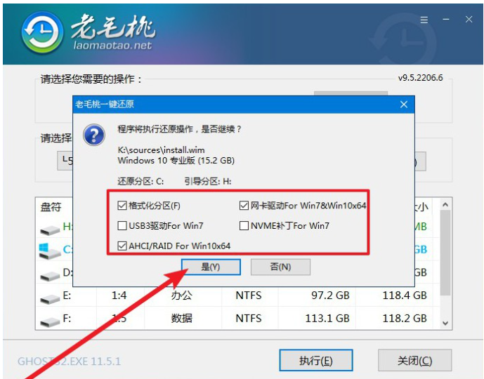 2、在一鍵還原窗口中,如無其他特別情況,建議默認設置,直接點擊“是”。