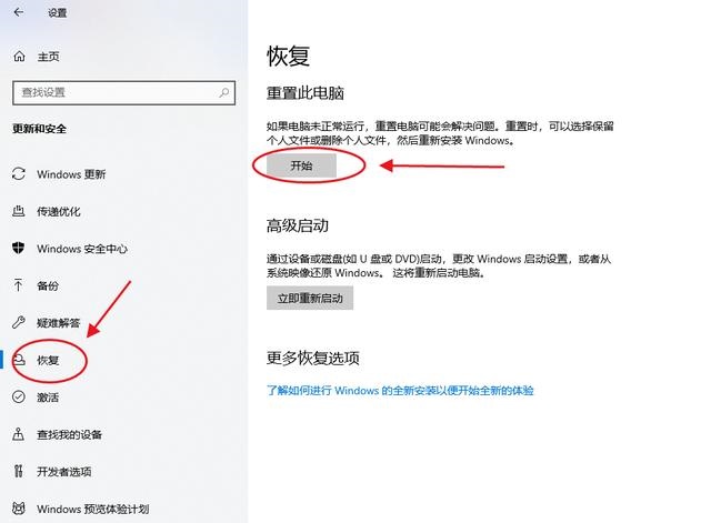 2、隨后點擊“恢復”,選擇“開始”
