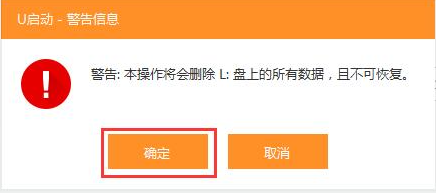 2、請大家確認u盤中數據是否另行備份,確認完成后,鼠標點擊“確定”。