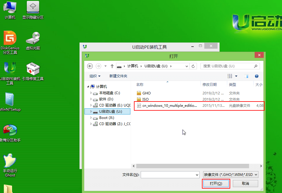 6、打開啟動u盤,選中win10系統鏡像文件后,鼠標點擊“打開”。