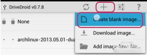 1、首先給手機安裝DriveDroid軟件,并要將手機root。root前注意備份好手機重要資料并保證至少有10g的剩余空間用來放pe鏡像以及系統鏡像文件。打開軟件后點擊加號,創建空白的鏡像。