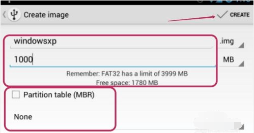 2、然后按照圖中所示輸入英文名字,這里可以輸入系統英文名稱方便辨別。然后設置大小。圖示是xp系統,如果win7最少要5000所以根據自己的需要設置。輸入好了,點擊右上角的箭頭位置等待創建完畢。