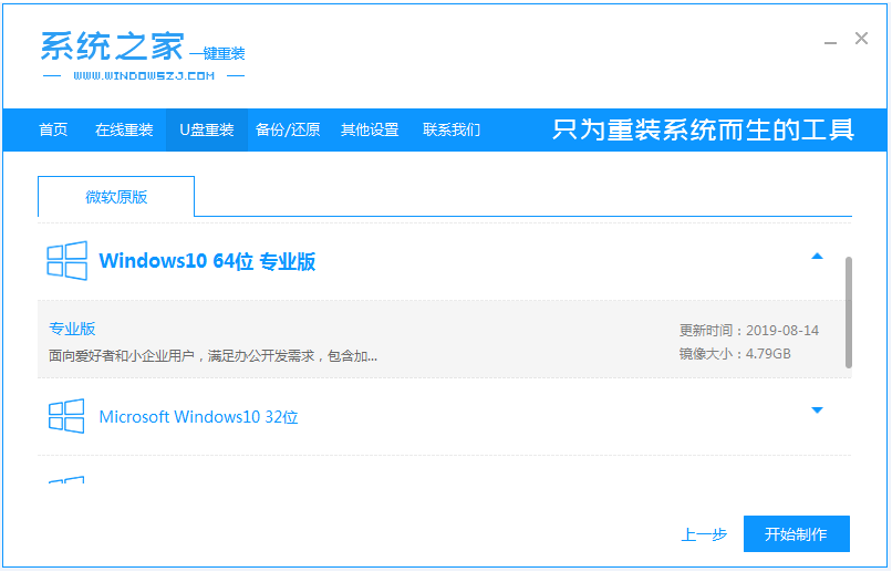 2、選擇win10專業版系統,點擊開始制作u盤啟動盤。