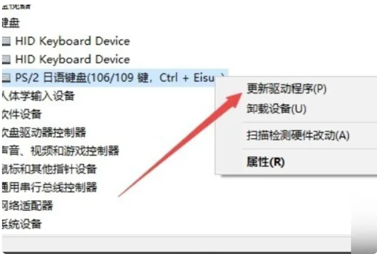 6、右鍵點擊鍵盤驅動程序,然后在彈出菜單中選擇“更新驅動程序”菜單項。