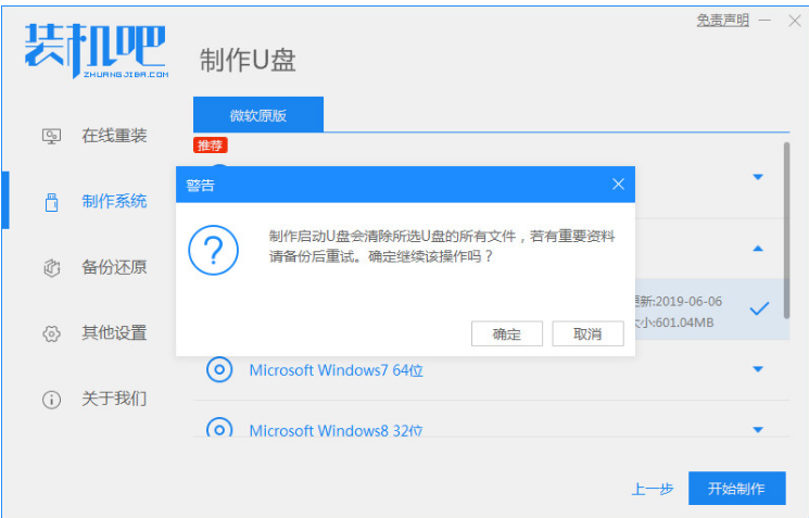 1、首先我們下載安裝裝機吧一鍵重裝系統軟件到電腦上并打開。然后準備一個8GB以上的U盤。我們選擇制作系統,點擊開始制作.
