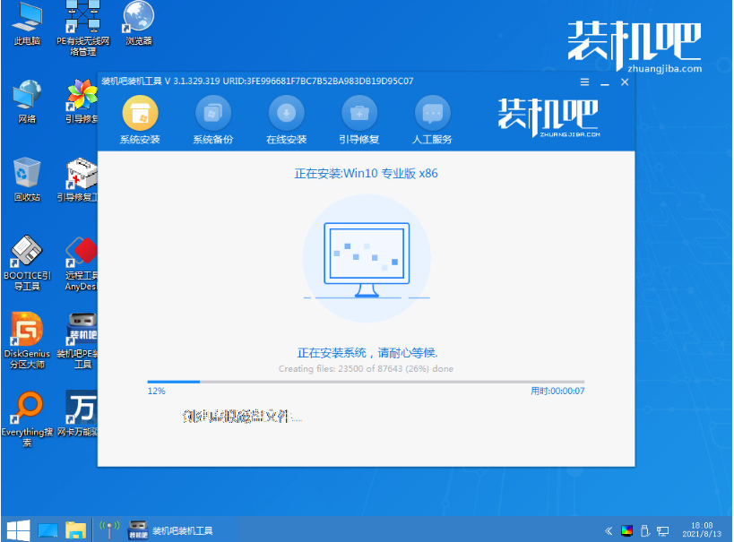 4、在pe系統內,裝機吧裝機工具自動打開并安裝win10系統,完成后自動重啟電腦。