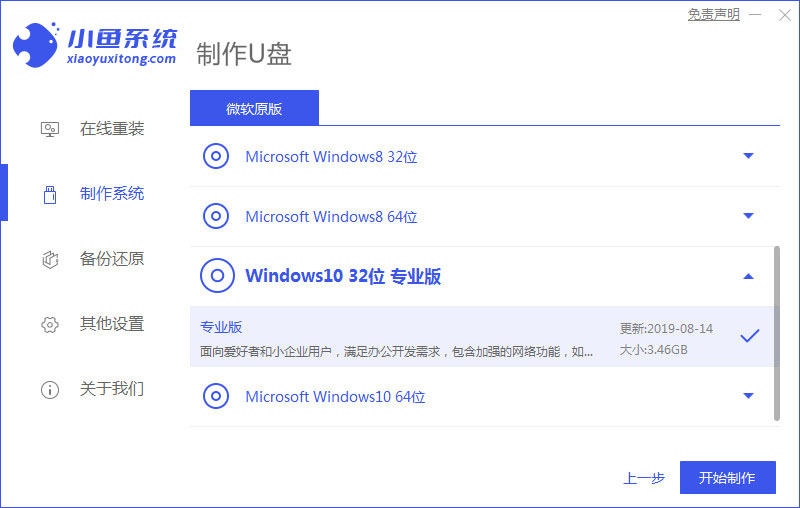 2、選擇需要安裝的系統版本,點擊開始制作。