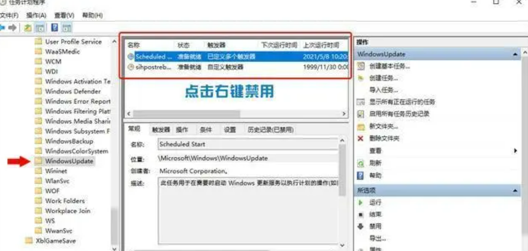 2、在任務計劃程序的設置界面,依次展開 任務計劃程序庫 -> Microsoft -> Windows -> WindowsUpdate,把里面的項目都設置為 [ 禁用 ] 就可以了。