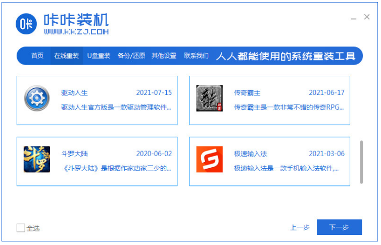 1、首先下載安裝咔咔裝機工具到電腦上,雙擊打開,選擇需要安裝的系統版本,點擊下一步。