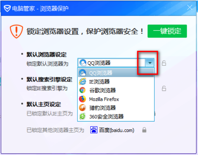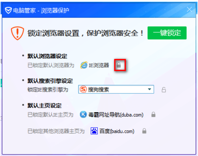 2、進入到騰訊電腦管家瀏覽器保護界面,如下圖所示,界面有默認瀏覽器設定、默認搜索引擎設定、默認主頁設定等選項,我們要設置默認瀏覽器,所以需要先將默認瀏覽器解鎖,點擊下圖紅色框中的鎖形圖標。