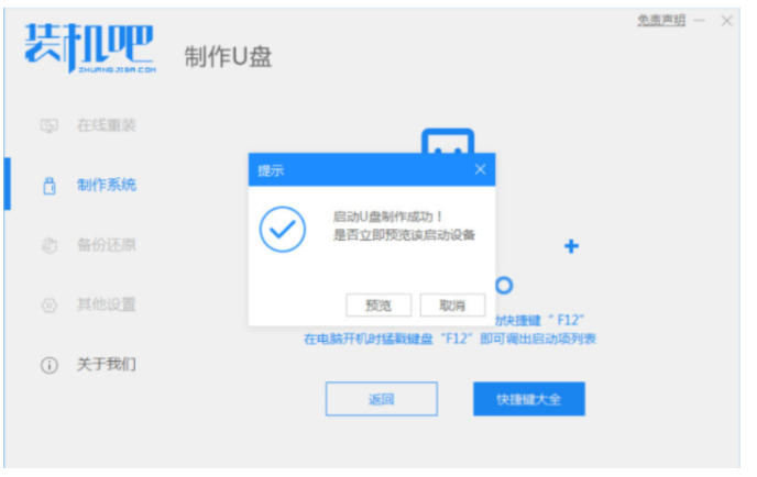 3.等待裝機軟件制作u盤啟動盤成功,快速預覽需要安裝的電腦主板的啟動熱鍵,再拔除u盤退出。