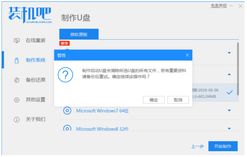 1、下載安裝裝機吧一鍵重裝系統軟件到電腦上并打開。準備一個8GB以上的U盤。選擇制作系統,點擊開始制作按鈕.