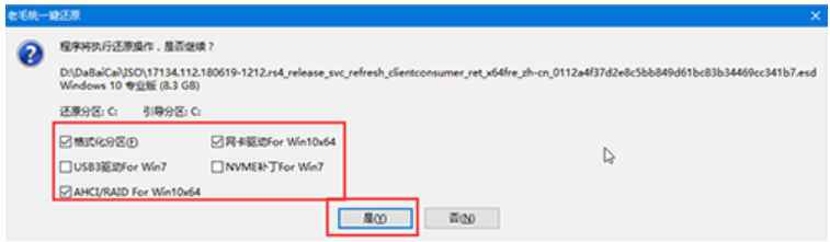 6、 頁面會彈出“一鍵還原”提示框,我們默認勾選,點擊“是”繼續安裝 即可。