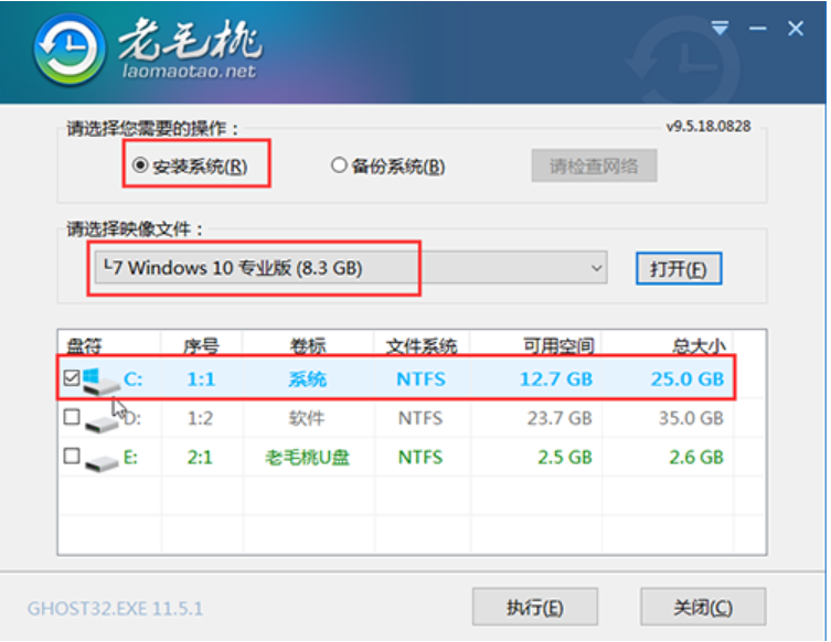 5、 打開老毛桃一鍵裝機,選中win10系統鏡像,安裝在C盤,點擊“執行”進入下一步即可。