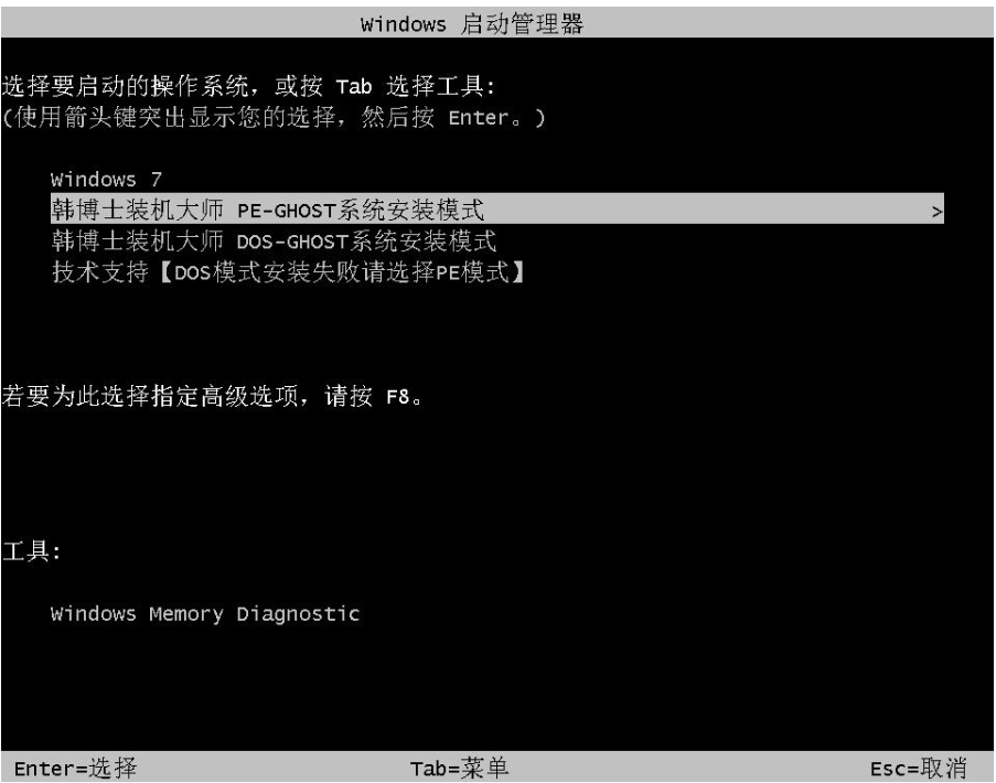 4、進入啟動管理器界面,選擇PE模式回車。
