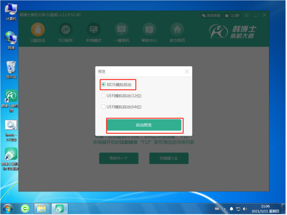 6、U盤啟動盤制作完成,出現啟動預覽的選擇項,需要先點擊“BIOS模式啟動”,然后再點擊“啟動預覽”。