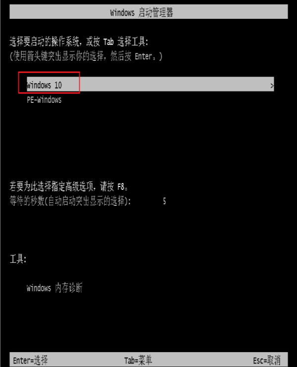 9、再次進入到啟動管理器頁面,選擇windows10,回車。