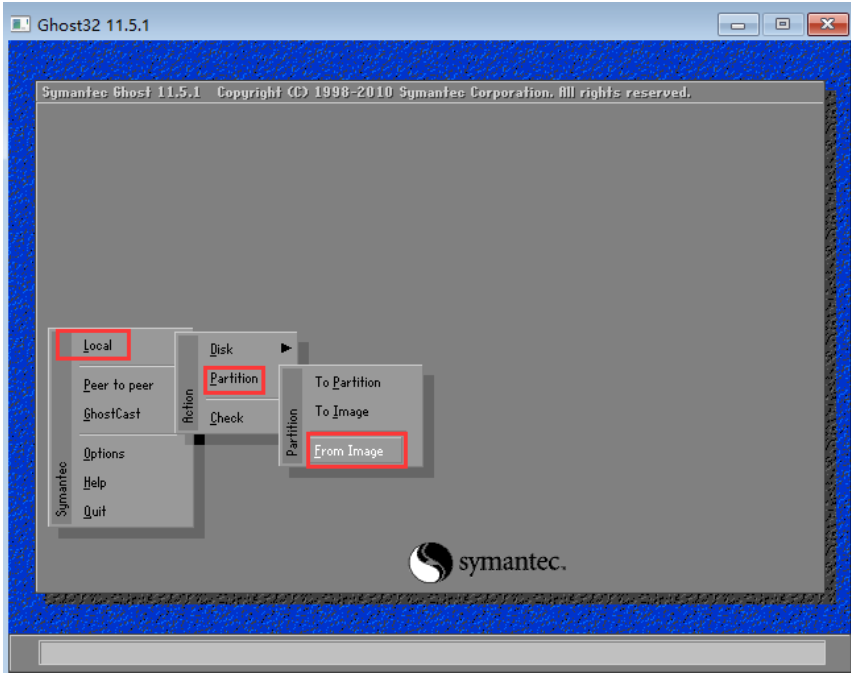 2、在彈出的窗口中,依次點擊“local”—“partition”—“form image”,尋找U盤的盤符和系統的所在。