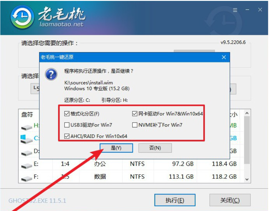 8、在老毛桃一鍵還原的窗口,通常保持默認設置,點擊“是”即可。