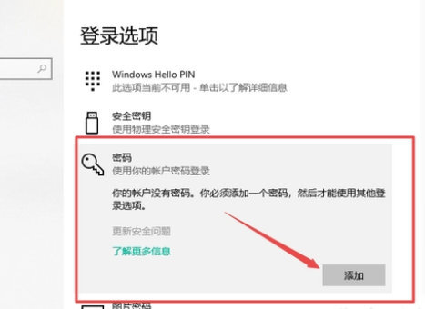 7、開機密碼就取消了。后續如果需要再次設置開機密碼的,可以在登錄選項的密碼中,點擊“添加”之后去設置開機密碼即可。