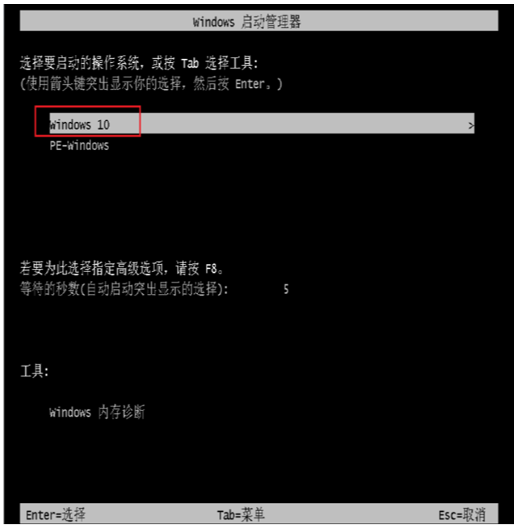 9、再次進入到啟動管理器頁面,選擇windows10,回車。
