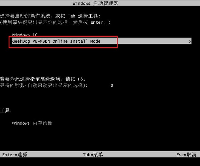 8、電腦重啟選擇“GeekDog PE”進入系統安裝狀態。