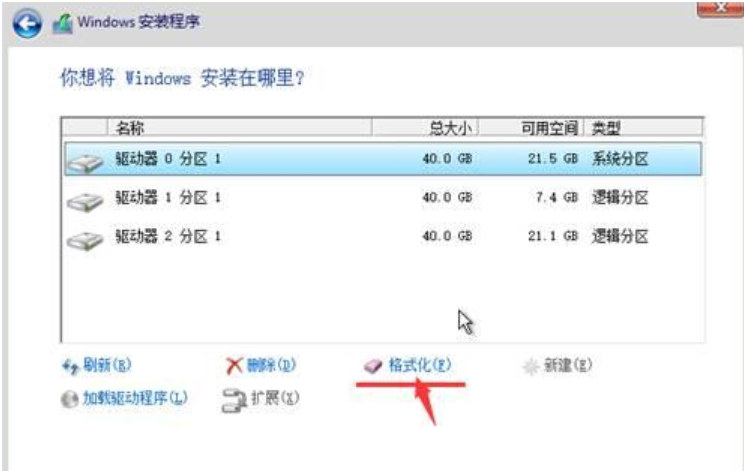 8、選擇分區1的系統分區,點擊“格式化”,再點擊下一步。