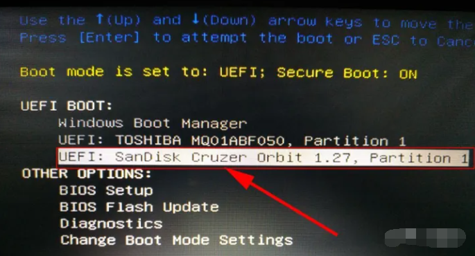 2、在這里以戴爾筆記本為例,開機時按F12,出現下圖所示時,我們使用上下鍵選擇U盤后回車,然后U盤品牌為閃迪,可以看到下面紅框標記里有「SanDisk」字樣。(各品牌電腦出現的界面略有不同,但大同小異。)