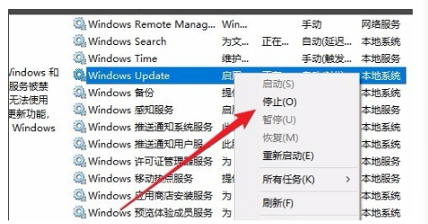 3.此時將會打開Windows10服務列表,在列表頁面中我們找到Windows Update服務項,鼠標右鍵點擊該服務項,在彈出菜單中選擇“停止”菜單項。