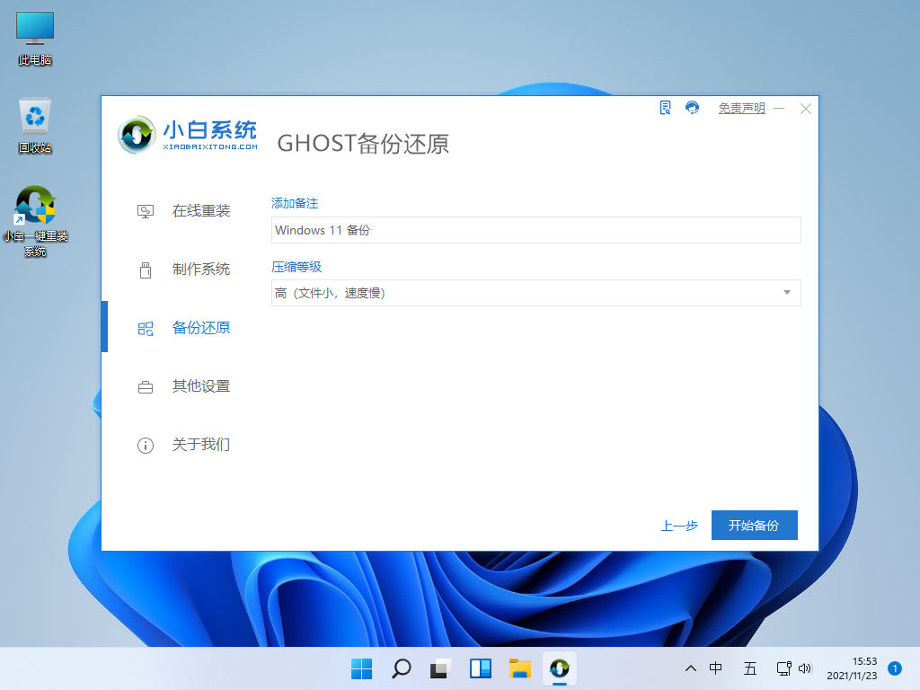 5、這里選擇是進入 PE 系統執行 Windows 11 備份,所以進入后會自動打開小白工具開始執行備份。備份完成后選擇立即重啟。