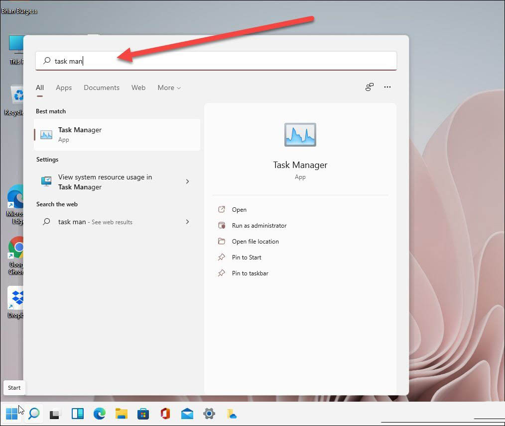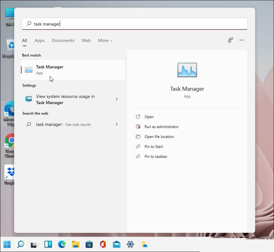 2、此外,您可以單擊“搜索”圖標并鍵入: 任務管理器,然后單擊您獲得的最上面的結果——就像在 Windows 10 上搜索內容一樣。