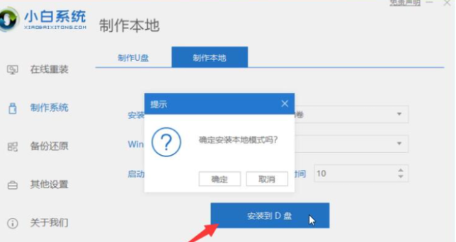 3、當我們打開小白一鍵重裝系統軟件之后,選擇制作系統按鈕,選擇制作本地,安裝路徑選擇除C盤外的其他盤,比如D盤。
