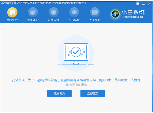 8、顯示安裝完成,這是要拔掉U盤,點擊立即重啟。
