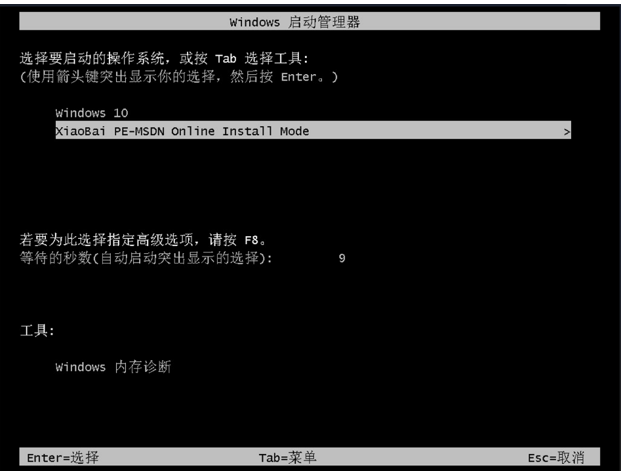 6、重啟后進入啟動管理項,選擇xiaobai pe-msdn選項,回車。