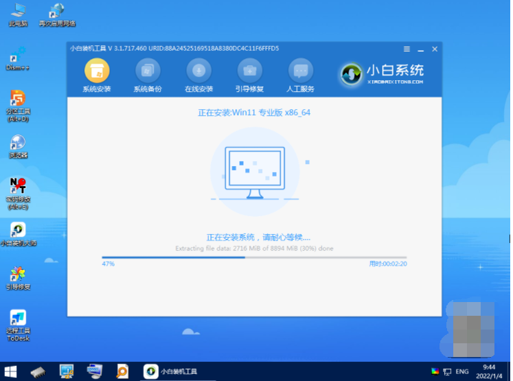 5、在pe系統內,小白裝機工具自動安裝windows11系統。