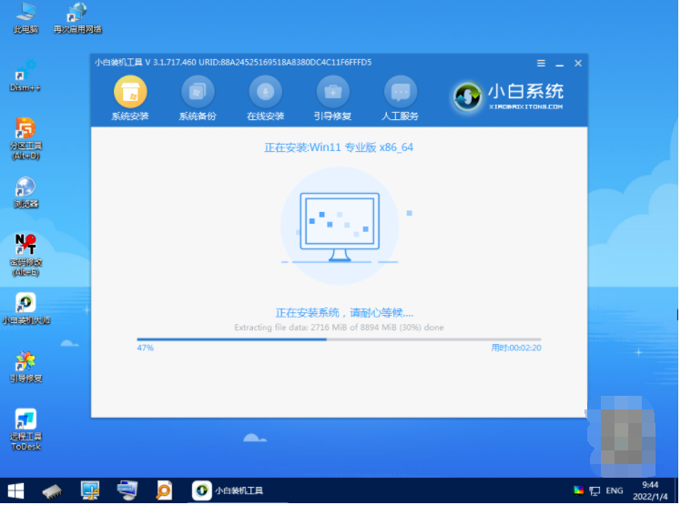 5、在pe系統內,小白裝機工具自動安裝win11系統。