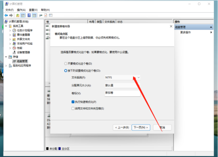 7、磁盤格式要選擇為NTFS,點擊下一頁等待分區完成即可。
