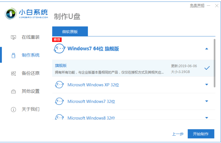 步驟一:我們首先下載并安裝好小白一鍵重裝系統工具然后此軟件打開,插入一個8g以上的空白u盤,然后選擇制作系統打開制作啟動盤即可。