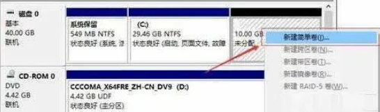 5、右擊未分配的磁盤,選擇新建簡單卷。