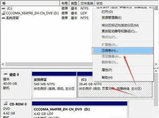 2、在管理界面,右擊C盤。選擇壓縮卷。