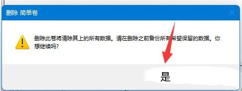 4、刪除簡單卷。注意該操作前要備份所有希望保留的數據。沒問題的話,點擊是即可。