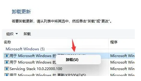 步驟六:卸載更新過程中,找到有可能引起電腦閃屏的更新,單擊右鍵,在打開的菜單項中,選擇【卸載】。