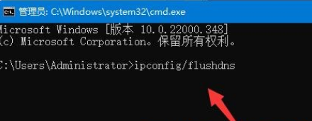 2、進入到命令提示符窗口,輸入 ipconfig/flushdns 刷新 DNS 緩存,按回車鍵即可。